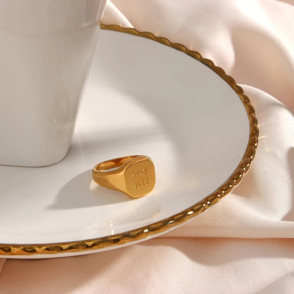 - Style: These golden square-cut rings feature the top engraved with powerful words of positive affirmation. The clean and modern design, combined with uplifting messages, makes these rings not only a stylish accessory but also a source of daily motivation.