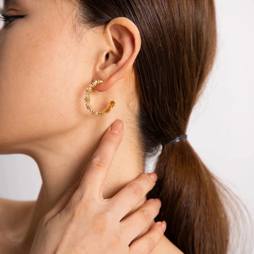 - Style: This delightful set features a cohesive design across the bracelet and necklace, with charming daisy flowers separated by tiny pearls woven throughout the chain, creating a continuous flow of natural beauty. The earrings complement the set with a hoop design, adorned with daisies encircling the entire hoop, offering a playful yet sophisticated appearance.