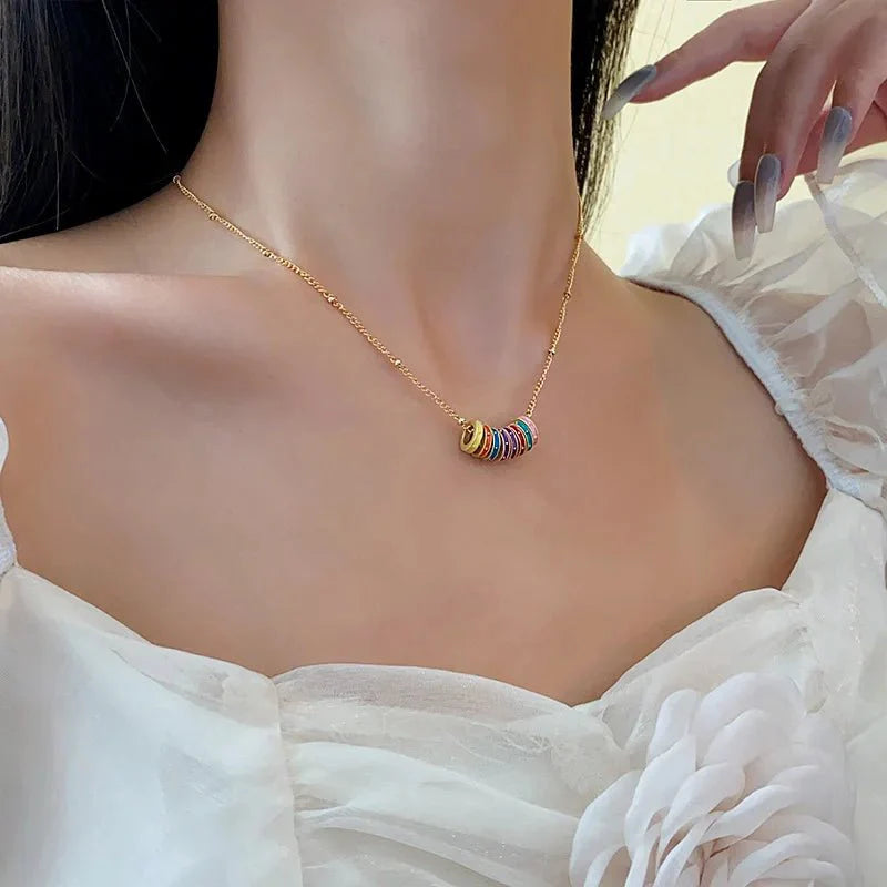 - Style: Features multiple colorful circles accented in gold as pendants. The necklace boasts a thin gold chain, while the earrings are stylish gold hoops with matching colorful circle pendants.
